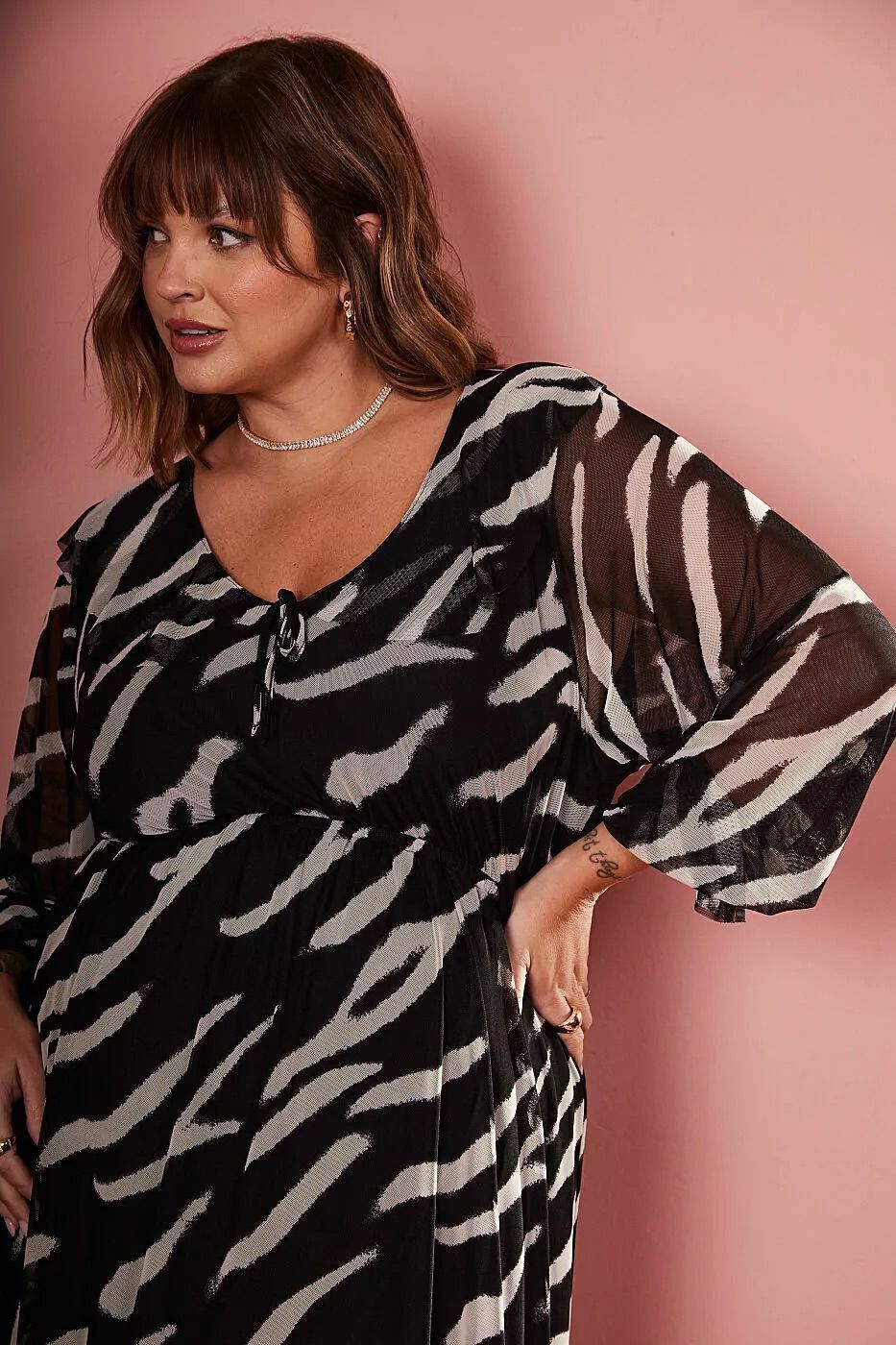Leve, delicado e cheio de charme, nosso vestido em tule estampado é a escolha perfeita para looks românticos e elegantes. Com mangas 7/8 e decote em V, ele valoriza a silhueta de forma sutil e feminina.